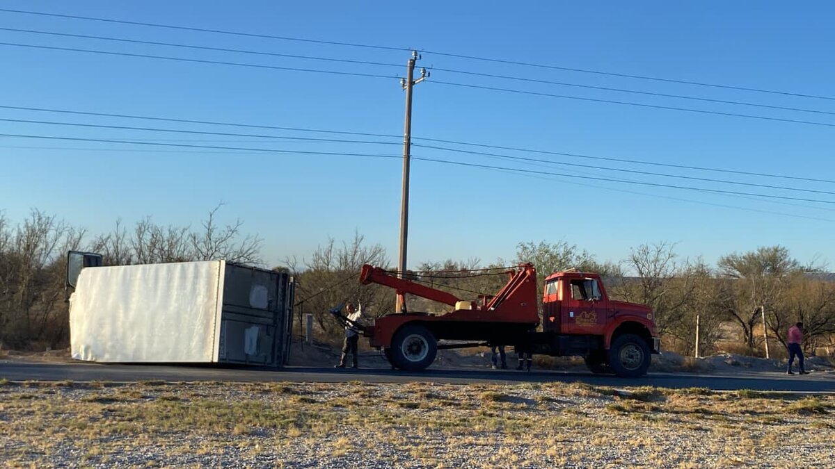 La tarde del jueves se registró una fuerte volcadura en la carretera federal 57, al norte de Monclova, donde un camión de carga terminó seriamente dañado y su conductor, contra todo pronóstico, resultó con lesiones menores.
